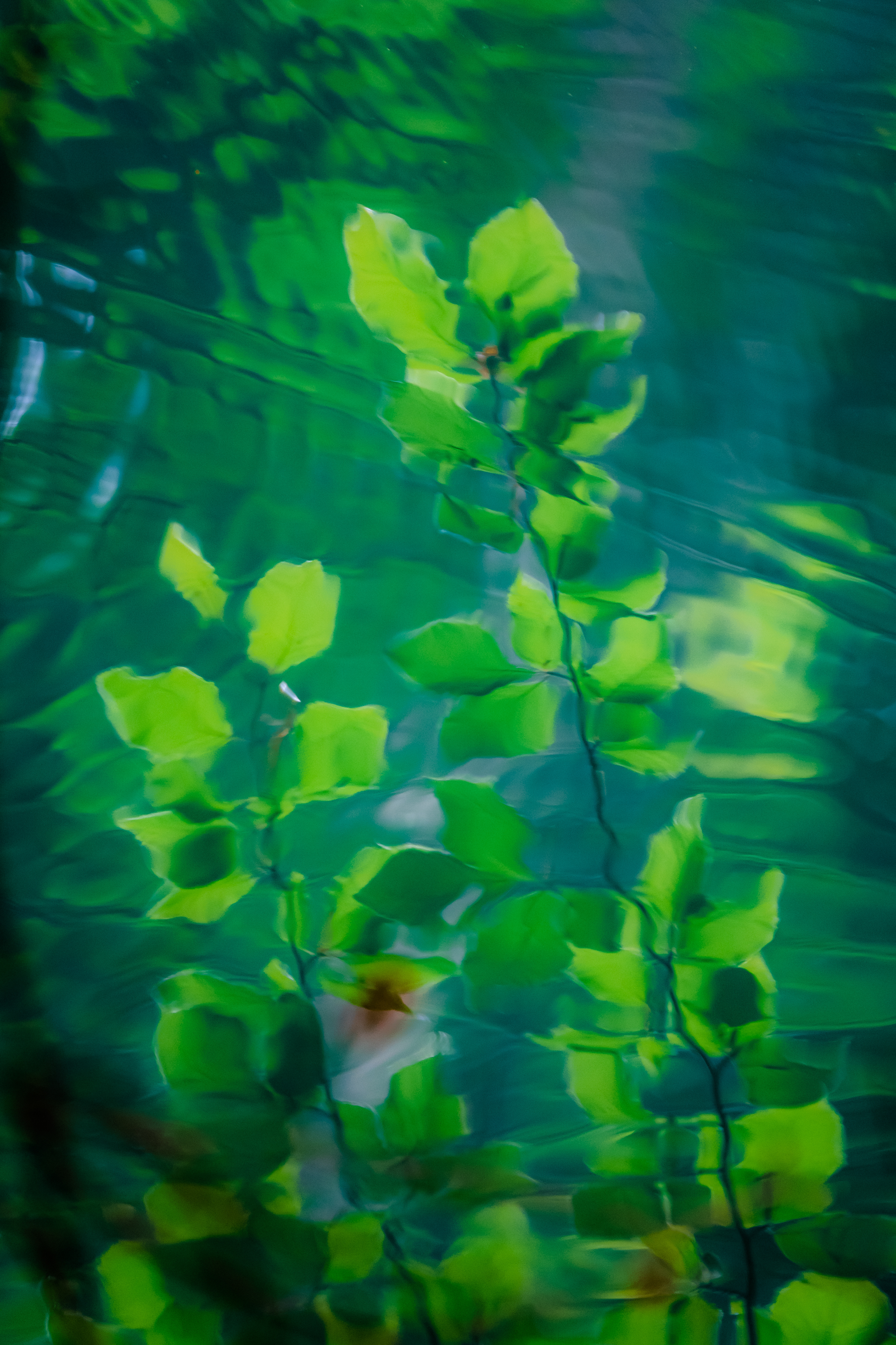 Die Spiegelungen der frischen Blätter verschmelzen mit den Konturen der leicht bewegten Wasseroberfläche